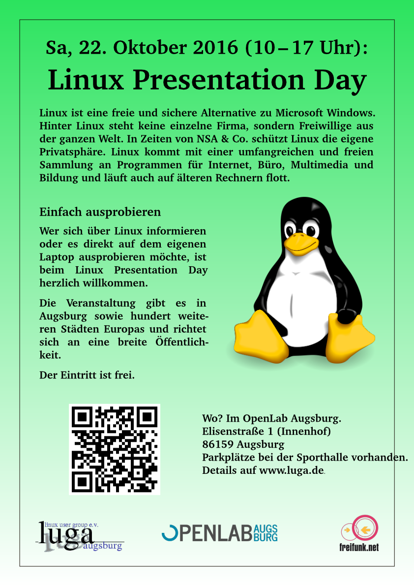 Die Linux User Group Augsburg übernimmt zusammen mit dem OpenLab Augsburg die Organisation des Linux Presentation Day 2016.2 in Augsburg. Diese Informations- und Mitmachveranstaltung findet am 22. Oktober 2016 von 10:00 Uhr bis 17:00 Uhr statt.